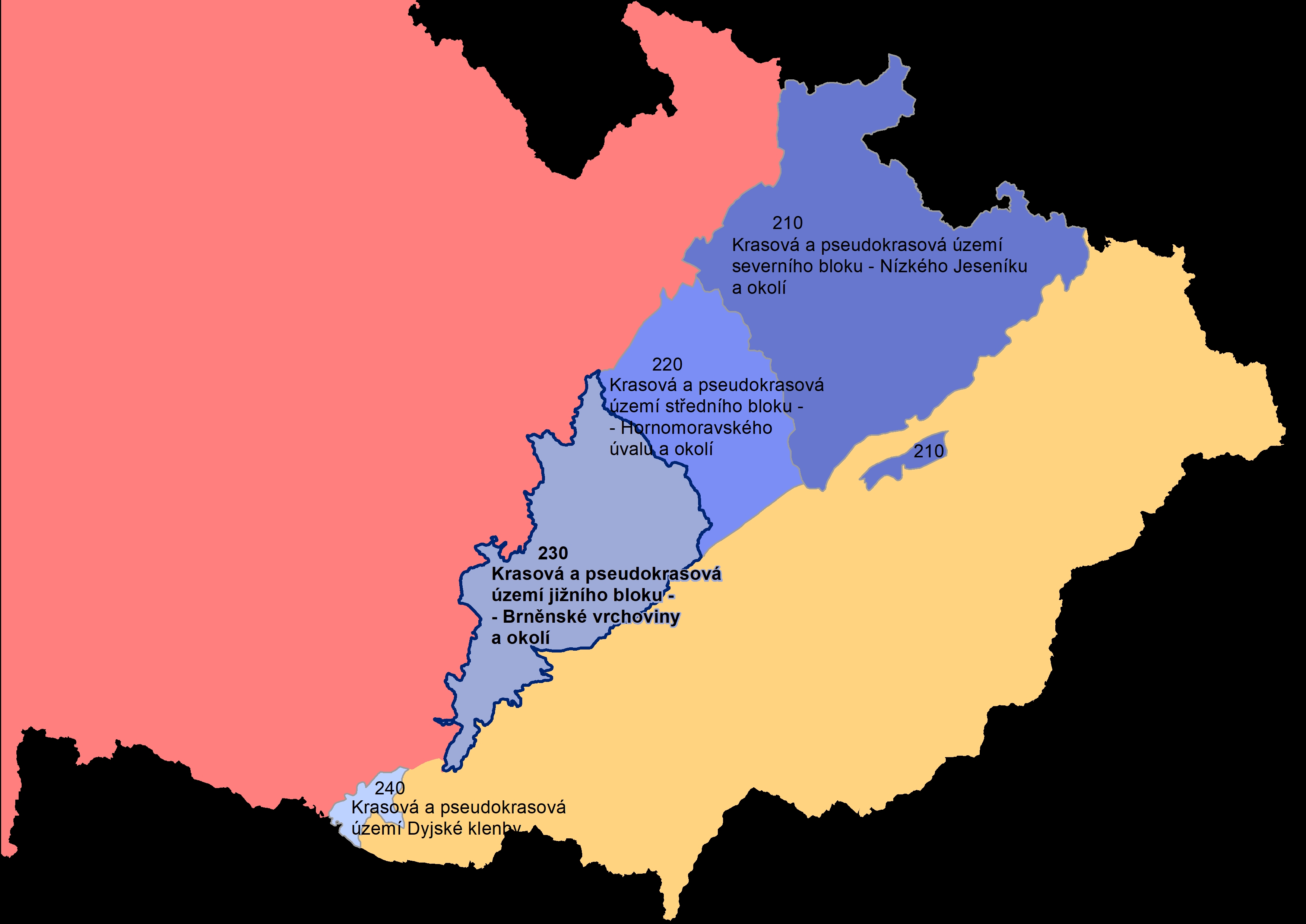 a pseudokrasové oblasti (geomorfologické celky):
