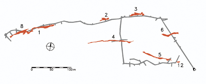Od parkoviště se pěšky vydáte po silnici směrem k Jílovému a po 714 m dojdete ke Kapli Jména Panny Marie (bod 2), kde narazíte na zeleně značenou turistickou cestu. Před kaplí odbočíte po zelené značce doleva, projdete roztroušenou zástavbou a po dalších 1.130 m dojdete k okraji lesa. Turistická značka v něm po 24 m odbočuje doleva nahoru (bod 3), Vy však půjdete rovně a po 200 m se bude cesta rozdvojovat. Dáte se klesající úvozovou cestou doprava a po 80 m dojdete k lesní asfaltované cestě (bod 4). Půjdete po ní směrem doleva a po 400 m dojdete k točně na konci asfaltky (bod 5). Pokračujte po strmě stoupající cestě a po 65 m stojíte před nerezovými dveřmi, uzavírajícími vstup do podzemí (CÍL). Celkově jste 2600 m od parkoviště.